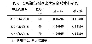 平原區填土高度h≤6.5 m的小橋,可采用薄壁臺,軟基段宜控制在6.0 m以下?,F運營的高速路中有些薄壁臺出現開裂現象,設計時應特別引起注意。