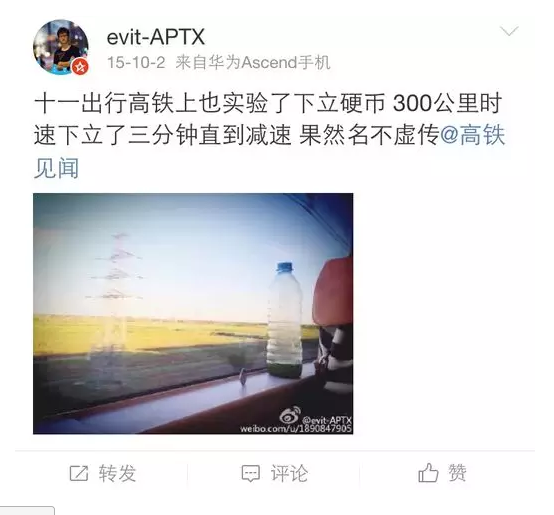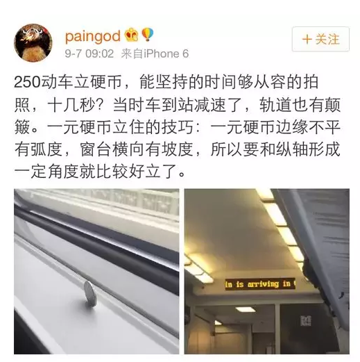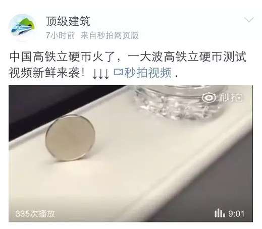 各路中國(guó)網(wǎng)友開(kāi)始踴躍證明,用一元硬幣在高鐵上做起了立硬幣實(shí)驗(yàn)(一元人民幣厚度是1.85毫米),結(jié)果硬幣依然傲然挺立,表示毫無(wú)壓力。