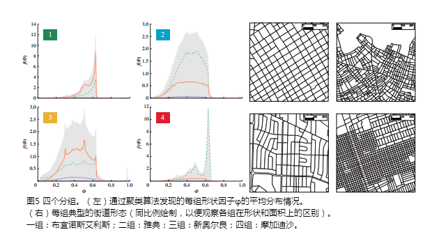 他們將那些城市地塊的尺寸、形狀繪制出來:有些城市的地塊形狀統(tǒng)一;另一些則有更多小型、曲線圍成的地塊。他們比較了地塊的不同分布,將眾多城市劃入四個(gè)不同“組別”: