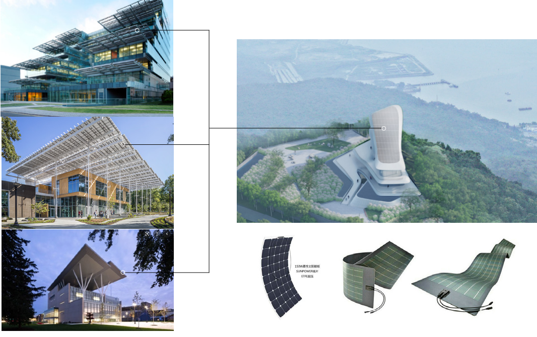 在綠色節(jié)能設(shè)計(jì)方面,建筑屋頂采用柔性太陽能光伏發(fā)電板滿鋪模式。綠色低碳,節(jié)能減排,是響應(yīng)國(guó)家減碳降排、綠色節(jié)能的建筑設(shè)計(jì)要求。