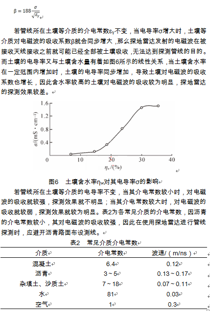 探地雷達發射高頻電磁波進行探測時,土壤等介質的對電磁波的吸收系數β與電導率σ成正比,即