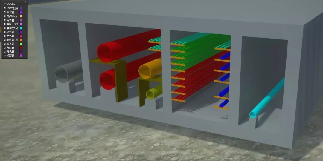重建管網(wǎng)現(xiàn)狀模型。項(xiàng)目區(qū)域地下管網(wǎng)錯(cuò)綜復(fù)雜,為探明復(fù)雜的管網(wǎng)現(xiàn)狀,避免設(shè)計(jì)延誤。項(xiàng)目組研發(fā)管網(wǎng)建模工具,重構(gòu)了完整的地下管網(wǎng)BIM模型,準(zhǔn)確定位,便于管廊設(shè)計(jì)與遷移。