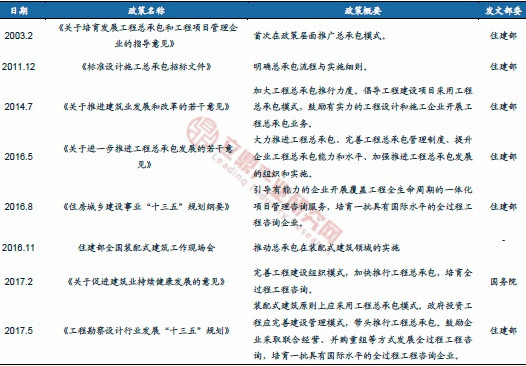 ——自2003年開始,國家陸續(xù)出臺政策推廣總承包模式,并引導裝配式建筑原則上使用總承包模式。2016年住建部發(fā)布《關于進一步推進工程總承包發(fā)展的若干意見》,《意見》強調(diào)大力推進工程總承包,提升項目可行性研究和初步設計深度,實現(xiàn)設計、采購、施工等各階段工作的深度融合,提高工程建設水平。