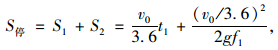 式中,v0為汽車運行速度;f1為縱向摩阻系數(shù),依車速及路面狀況而定;g為重力加速度(9.8 m/s2);t1為駕駛者反應時間,取2.5 s(判斷時間1.5 s,運行時間1.0 s)。