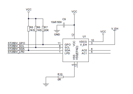 射頻閱讀器和識別器的核心在于RFID芯片。通常RFID芯片供電電壓1.8V-5.5V,帶有4K、16K或64K的E2PROM,通過片內(nèi)串行總線I2C或者射頻進行數(shù)據(jù)傳輸。圖2為RFID芯片ST25的識別器電路原理圖。射頻識別芯片通過SCL和SDA和主控制器芯片完成通訊。控制器再和上位機完成信息交換傳輸。
