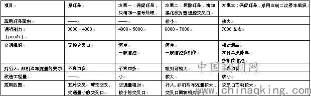 根據(jù)以上分析的環(huán)形交叉口可進(jìn)行的改造方案,對(duì)各個(gè)方案見進(jìn)行比較,結(jié)果如下表1。